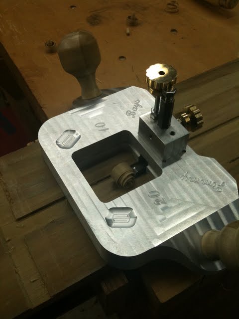 The Renaissance Woodworker left a comment on my last post pretty much confirming what I already assumed. The bottom of the iron should be at a slight angle to the body to ensure that the edge contacts the material to be cut before the heel. My step-dad did some clean up work on the irons using a grinding wheel mounted in the mill and the iron mounted at a slight angle. This seems to have resolved the problem. We decided to add a little decoration since we had the time and the means. This is the fastest I have ever written my name in metal. It may well also be the only time I have written my name in metal.