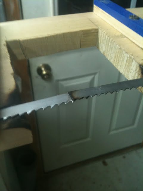 It all starts with a little jig I made to hold the blade. It is really just a board that I used a shoulder plane to make a rabbit in. Then I made a couple of hold downs to screw to it and cut a hole to do the actual heating part in.